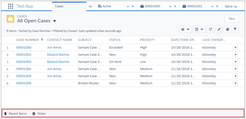 - Utility Bar: The utility bar gives your users quick access to common productivity tools, like Notes and Recent Items. It appears as a fixed footer that users can access to open utilities in docked panels. Under the covers, utilities harness the power of Lightning components. You can add a utility bar to any Lightning app. You can add items to it as shown below